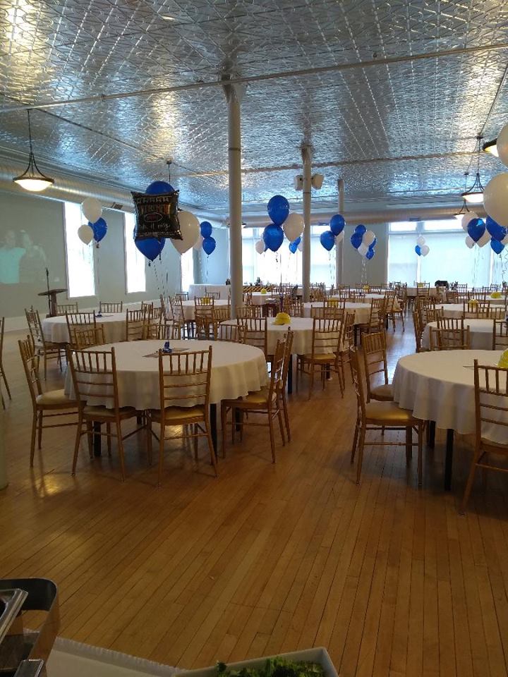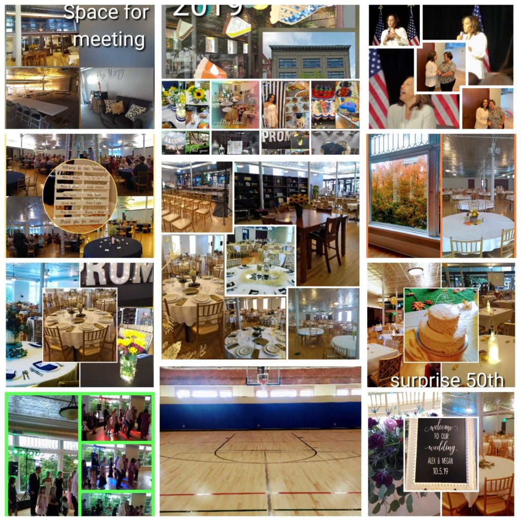 The seating capacity is for 260 with handicap accessibility and a large state of the art commercial kitchen. The space is perfect for Wedding Receptions, Graduations and larger events. We have different levels of the Loft to rent out for smaller events. The Loft one is on the main floor, accessible on Jefferson Street. The mezzanine is the balcony overlooking Loft one and can be used for small gatherings or meetings. The church basement has a room that is perfect for Birthday parties and can include a bounce house!